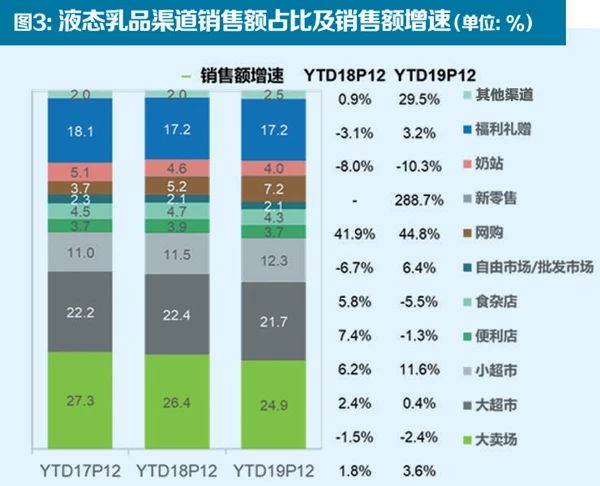 2019 年截至 P12,在液态奶销售渠道中,大卖场仍是主力,但网购销售增速加快。