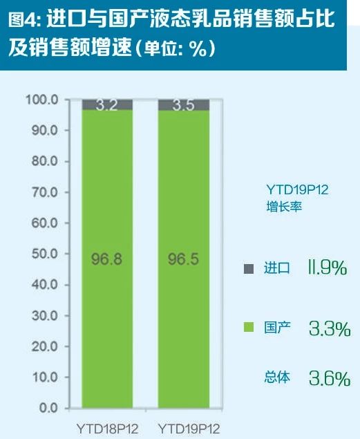 如图 4 所示,进口液态产品在液态乳制品中占比较低,但增长较快。2019 年截至 P12,国产液态乳制品在液态乳制品销售额中占比 96.5%,而进口液态乳制品仅为 3.5% 。但进口液态乳制品销售额增速显著大于国产液态乳制品,分别为 11.9% 和 3.3% 。