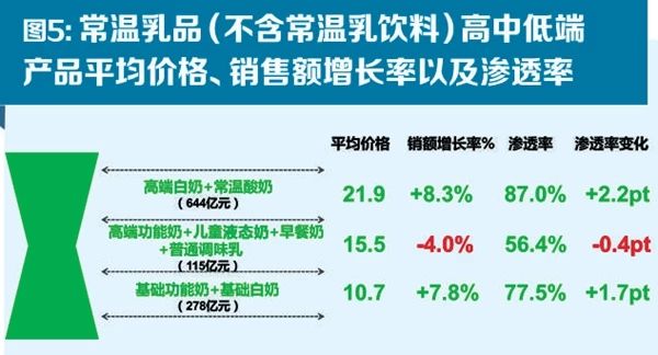 平均价格为 21.9 元/升的高端产品包含高端白奶和常温酸奶,销售额增长率为 8.3%,渗透率为 87%,较上年同期同比增加 2.2%;平均价格在 10.7 元/升的低端产品包含基础功能奶和基础白奶,销售额增长率为 7.8%,渗透率为 77.5%,较上年同期同比增加 1.7%;而平均价格为 15.5 元/升的中端产品包含高端功能奶、儿童液态奶、早餐奶和普通调味乳,销售额下滑,渗透率为 56.4%,较上年同期同比减少 0.4% 。