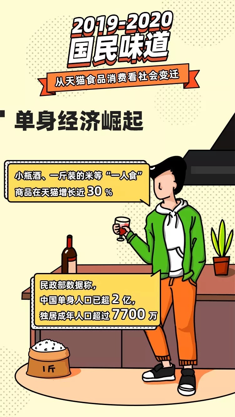 根据过去一年的消费,近日,天猫发布“2019-2020国民味道”数据报告,报告显示,一人食、健身餐、滋补品、原产地、跨界品、懒人速食将成为2020年六大年度美食趋势。