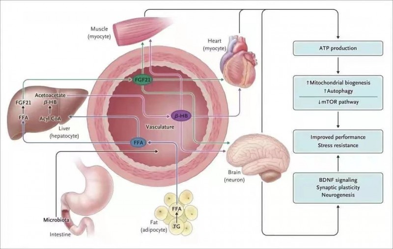 众所周知,葡萄糖和脂肪酸是细胞能量的主要来源,而在禁食期间,储存在肝脏中的葡萄糖会慢慢消耗。然后,肝脏就会将脂肪酸转化为酮体用于供能。也就是说,在间歇性禁食期间血液中酮体水平就会提升,而酮体是细胞和器官功能的重要信号分子,能够调节机体健康和衰老的多种蛋白和分子的活性及表达。