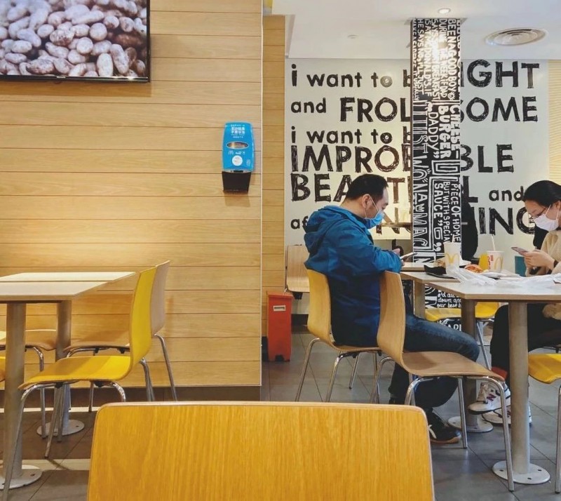 跟重庆的同事聊起这件事时,她也提到疫情期间有一次因为在家太闷,只好戴着口罩出门到就近的麦当劳写稿。同样地,当时店内顾客也并不止她一个。只要顾客取餐离开,清洁员就拿着消毒液喷洒、擦拭桌面。没有了往日热闹的气氛,人与人之间除了大眼瞪小眼没有任何交流,但一切就在无言中有条不紊地运转着。