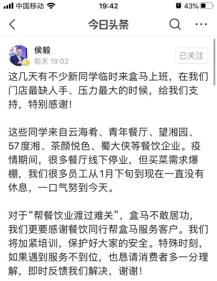 目前,57度湘、茶颜悦色、蜀大侠、望湘园等著名餐饮企业已与盒马达成合作,将共计支援盒马500多名员工。
