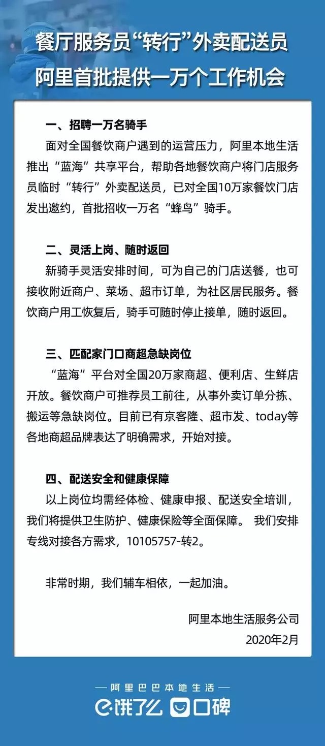 2月6日,阿里本地生活服务公司推出“蓝海”就业共享平台,全国餐饮商户可为员工报名,员工变身成为短期饿了么外卖员,或者阿里本地生活平台商超、便利店的“共享员工”。