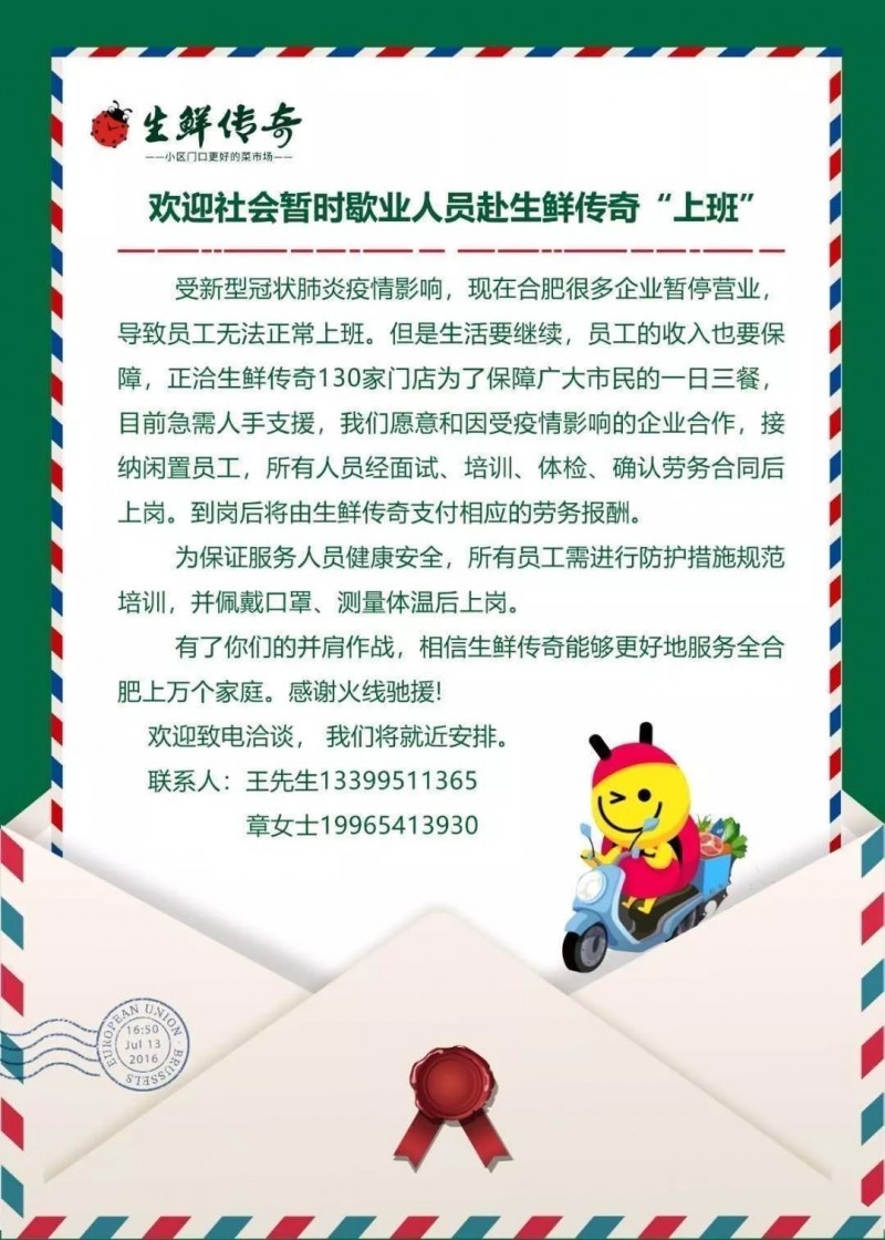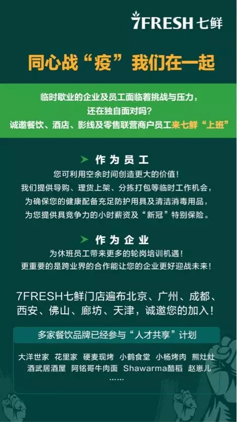 2月4日,生鲜传奇发出倡议,欢迎社会暂时歇业人员赴生鲜传奇“上班”。