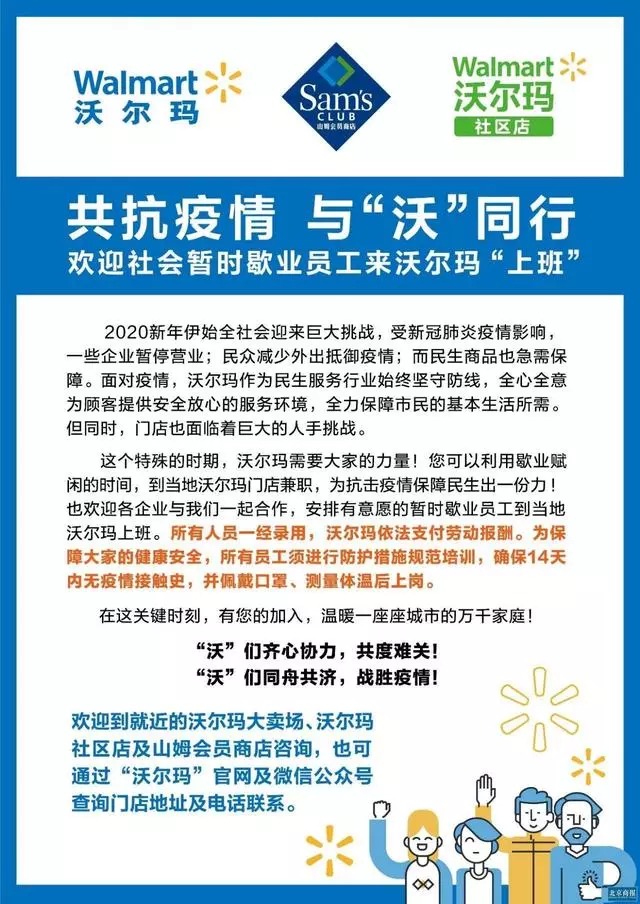 沃尔玛2月5日宣布,在特殊时期,欢迎社会暂时歇业员工来沃尔玛“上班”。