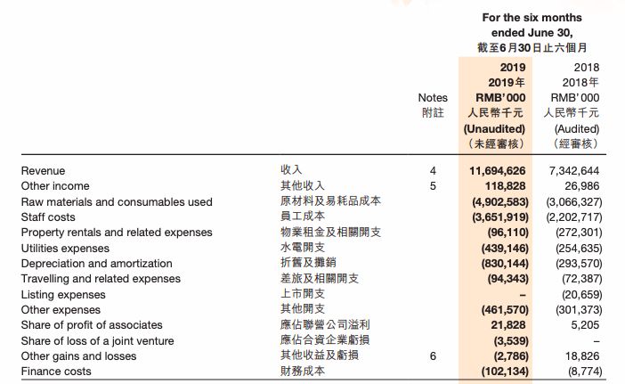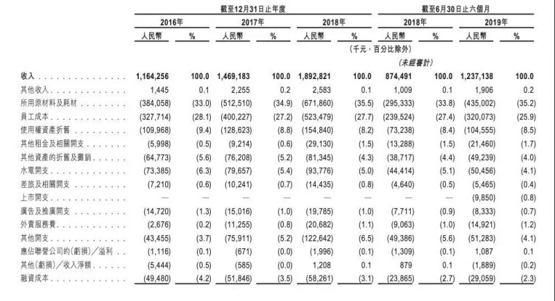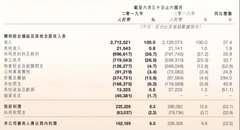 呷哺呷哺2019年上半年的员工成本为7.1亿元,物业租金及相关开支为1.26亿元,分别占收入的26.5%和4.7%。