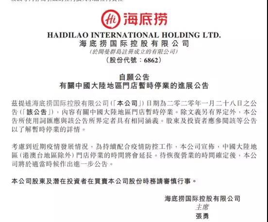 以海底捞为例,其湖北地区的门店自1月23日下午开始暂停营业,随后范围扩大到内地门店于1月26日至31日暂停营业。2月2日,公司再度发布公告称,考虑到疫情发展情况,中国大陆地区门店停业的时间将会延长,恢复营业的时间待确定。