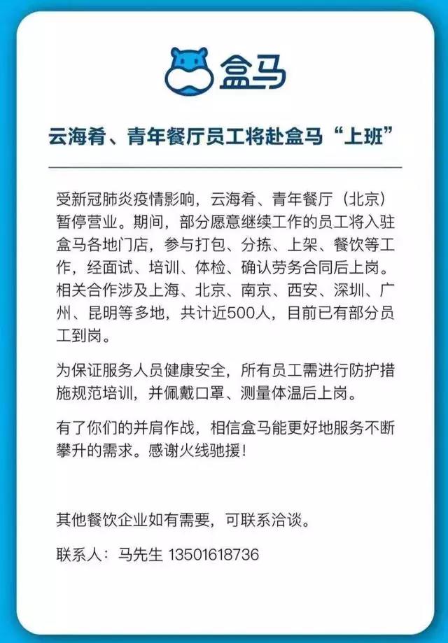 类似的例子还有每日优鲜和西贝、眉州东坡在人力调配上展开合作,每日优鲜提供原材料,西贝和眉州东坡提供人力负责加工。目前,沃尔玛、永辉、生鲜传奇等也都已发出邀请,欢迎友商或邻业的待业员工来“上班”。