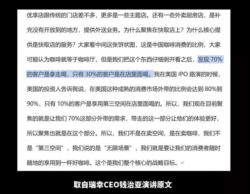 要知道,一杯30块钱的星巴克咖啡,其中咖啡豆、咖啡杯这些消费者最终手里拿到的原材料成本不超过5块钱,消费者支付的钱主要在于星巴克主打的“第三空间”费用,比如大头在房租和装修。但是你要知道,很多人去买咖啡并不是为了在星巴克蹭坐一下午电脑办公的,他们只是为了单纯享受一杯咖啡的浓香提神,瑞幸咖啡CEO钱治亚提到过这部分人群占70%左右: