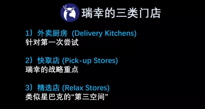 你可以在DannyData上看出早期的瑞幸门店以外卖厨房为主;随着时间的推移,瑞幸快取店迅速成为主导,快取店在2019年三季度的比例就已经占瑞幸整体门店的93%;而类似星巴克“第三空间”的瑞幸“精选店”,始终不是瑞幸的战略重点。