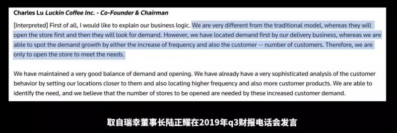 瑞幸董事长陆正耀解释过瑞幸和传统咖啡商业模式开店的区别,他说:传统模式是先开店然后再去寻找用户需求;而瑞幸的模式是先通过外卖咖啡寻找用户需求,当证明用户需求可行后,比如老用户复购足够多或新增用户数足够多,瑞幸再去决定开什么类型的店。