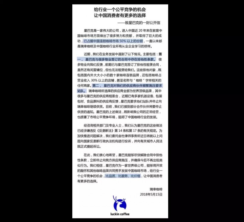 陆正耀说的传统咖啡商业模式,大家都清楚指的是星巴克,星巴克在中国开店就是“先选了好位置再说”。那星巴克为什么有底气敢这么开店呢?因为星巴克的品牌地位和光环已经摆在那里,都是中国的地产商“求爷爷告奶奶”请星巴克去自己的地方开店,又是免租金甚至还赠送装修费,赔钱也希望请星巴克去帮他们提高逼格吸引人流。同时星巴克还可以跟他们签下排他协议,这也是为什么瑞幸在2018年5月刚起步时就写下《致星巴克的一封信》,其实就是反映了瑞幸在扩张初期,被星巴克和地产商签下的各种排他协议所困扰。