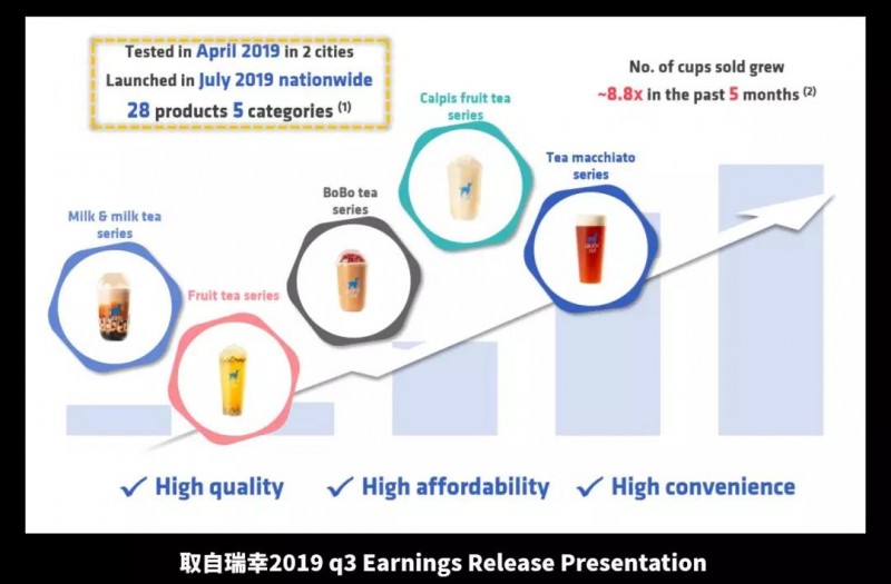 之前说到瑞幸的使命是starting with coffee,既然说咖啡只是开始,那终点一定不只是咖啡。瑞幸除了咖啡,还有从2019年4月测试、7月全国上线的五类28种茶饮,以“小鹿茶”作为茶饮品牌独立运营。瑞幸还有轻食、坚果、周边产品等其他的产品。