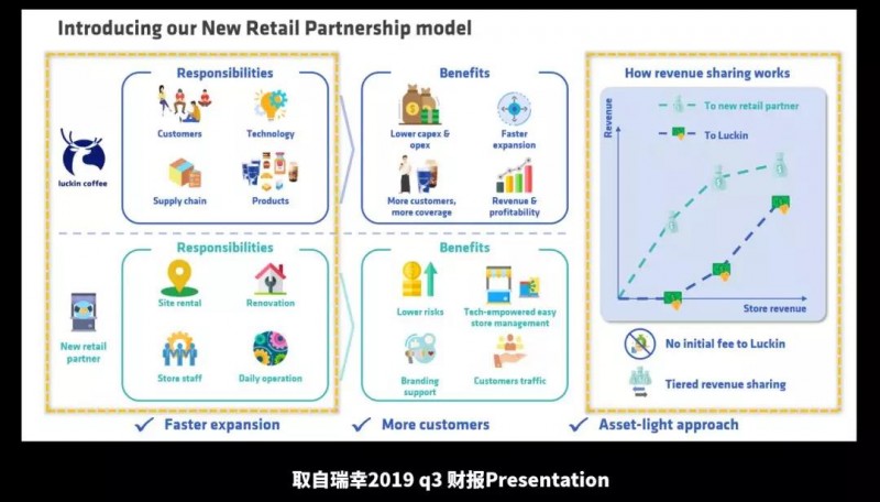 瑞幸在加盟这方面有一点做的很巧妙,没有初始的加盟费,前期收入主要归合作方,随着门店收入增加,瑞幸的收入比例提高,这一点确实是非常互联网打法了。