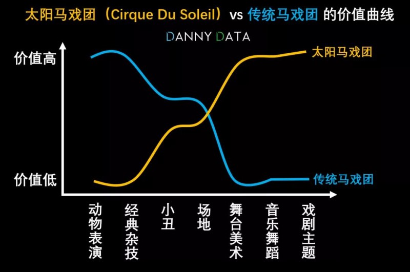 管理学中的一个经典案例就是加拿大的太阳马戏团,让马戏团这个夕阳行业重新焕发青春,太阳马戏团的策略是什么呢?就是把传统马戏团过时的元素剔除,比如动物表演、经典杂技等等,而太阳马戏团根据消费者的新需求重新塑造新的价值曲线,把舞台美术、音乐舞蹈、戏剧主题做到极致: