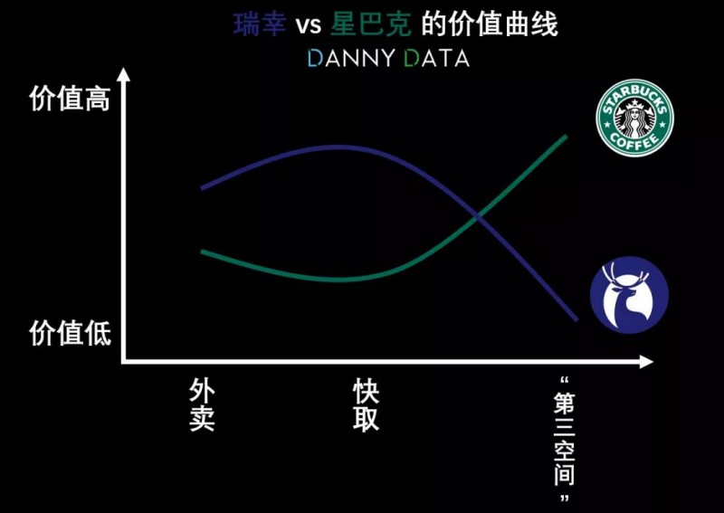 而瑞幸和星巴克相比,其实也是体现了不同的价值曲线,星巴克在“第三空间”的价值仍然处于领先地位,但是在外卖和快取方面,瑞幸的体验已经有所胜出:
