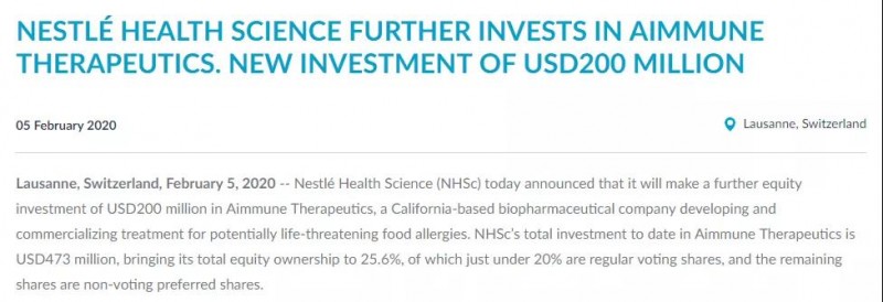 值得注意的是,就在雀巢本次出手前不久,Aimmune传出新动向。