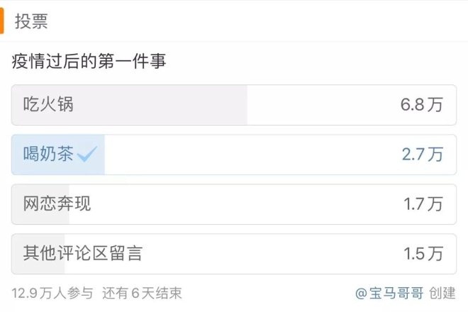 2月4日,微博热搜上“疫情过后的第一件事”,2.5亿的网友参与了讨论,在13.3万人参与的投票中,“第一件事喝奶茶”的人有28258个,排名第二。