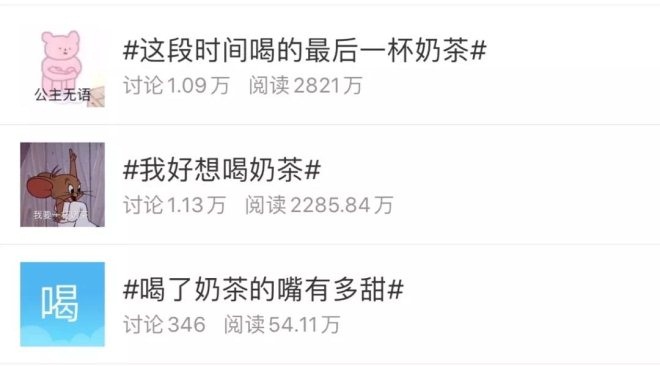 相关话题#这段时间喝的最后一杯奶茶#、#我好想喝奶茶#、#喝了奶茶的嘴有多甜#等话题,也都有千万级的阅读量。