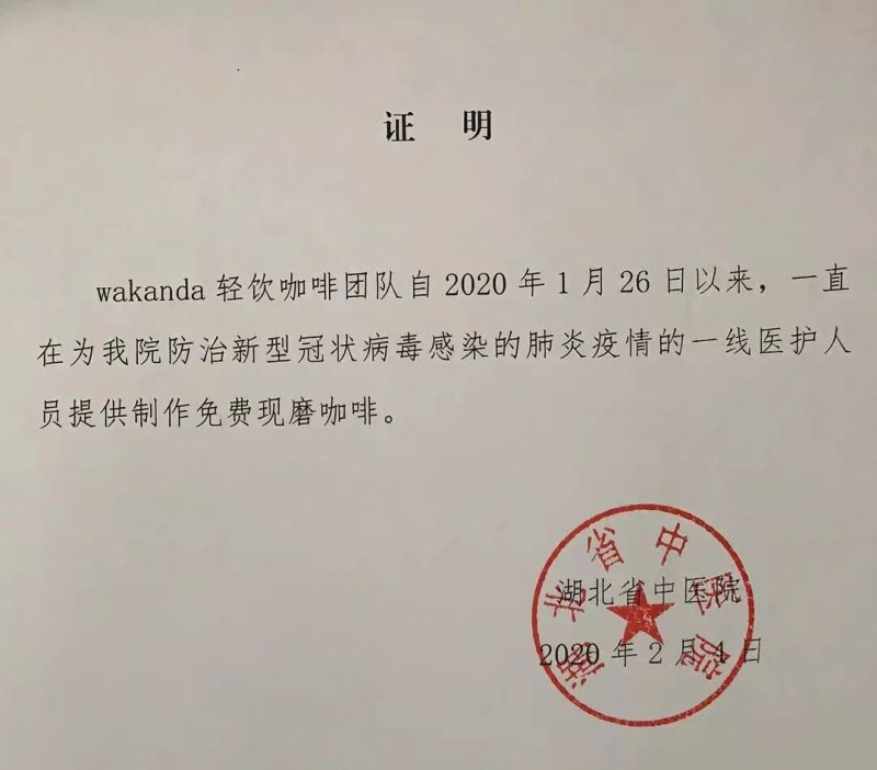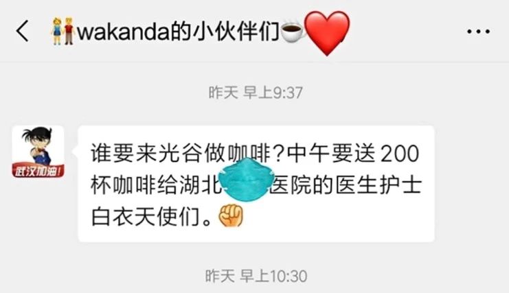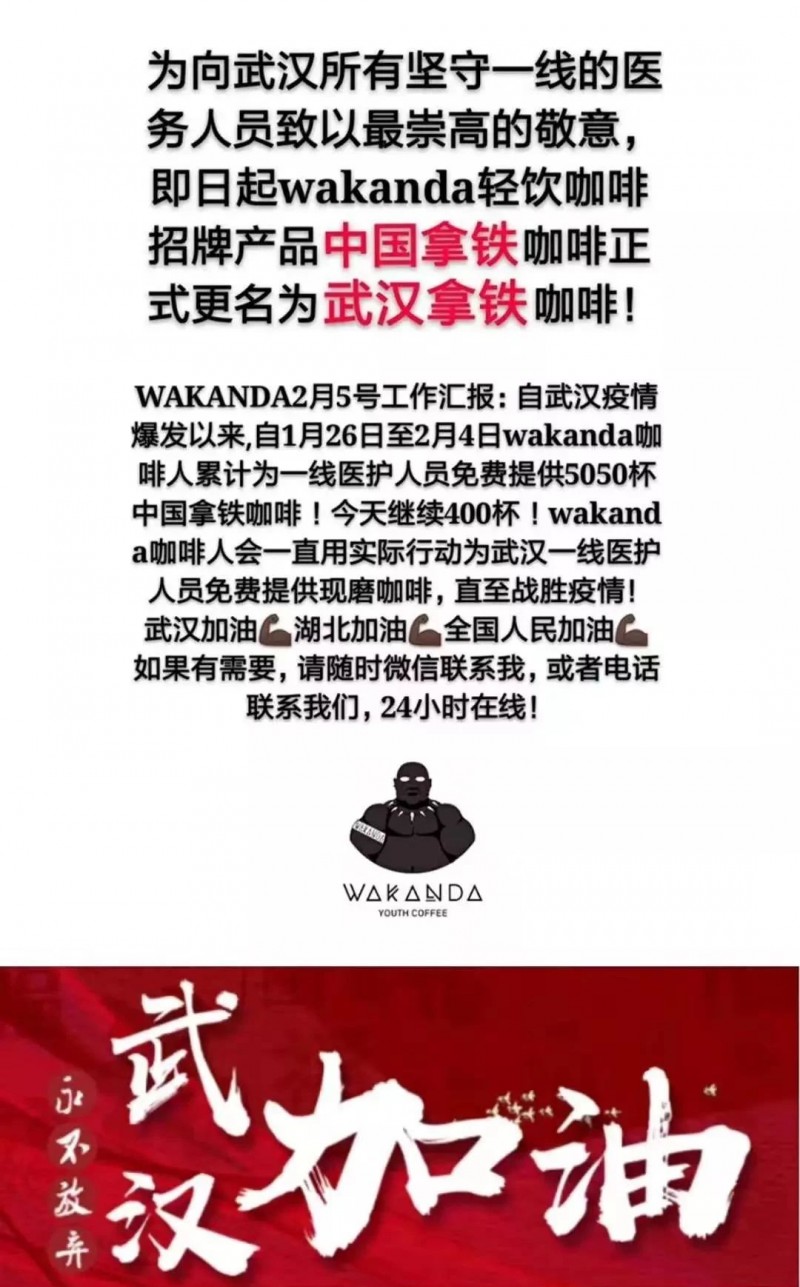 2月8号,Wakanda轻饮咖啡的工作汇报是:“自武汉疫情爆发以来, 1月26日至2月8日,wakanda咖啡人累计为一线医护人员免费提供6150杯“武汉拿铁”咖啡 !明天继续500杯 !Wakanda咖啡人会一直用实际行动,为武汉一线医护人员免费提供现磨咖啡,直至战胜疫情!”