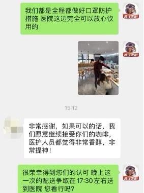 “这一次有两位医生和三名志愿者一起来接咖啡,按照约定流程接完咖啡之后,五名医护人员突然齐刷刷的向着我们鞠躬,那一刻我瞬间泪目。我们也赶紧给他们鞠躬,千言万语却不能说,相比于做几杯咖啡,医生才是真正的战士,他们的危险、辛苦我们不及十分之一。”田亚珍说。