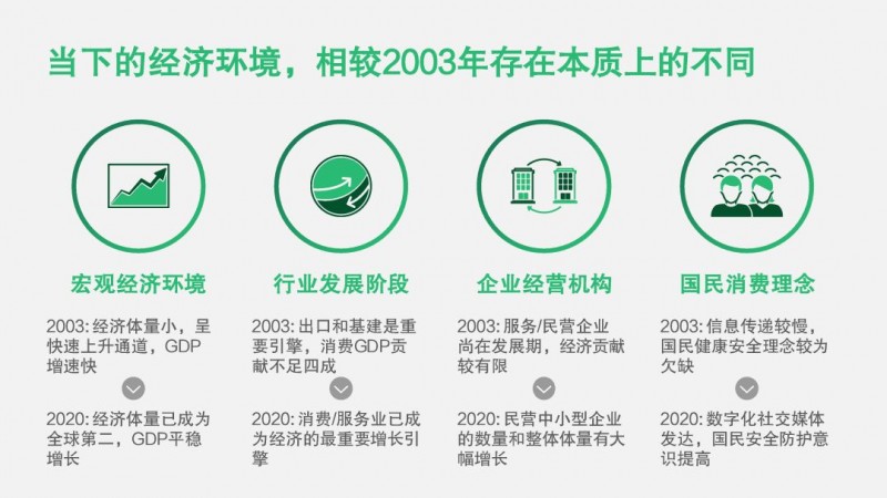 首要一点是宏观经济环境的变化。中国2003年的经济体量小,经济发展呈现快速上升的势头,2020年的中国已经成为全球第二大经济体,GDP增长态势平稳。行业的发展结构也随着经济的发展产生了重大变化,2003年出口和基建是经济支柱,消费GDP贡献不足四成。而如今,消费和服务业已经大步赶超,成为经济发展的增长主力。企业是经济发展主要参与者,民营中小企业17年来发展迅猛,从贡献有限成长为活跃力量。而大家体会最直接的莫过于国民消费理念的转变:非典时期,网络欠发达,信息传递速度和透明度相对较弱,国民的健康安全理念有所欠缺;如今再次面对疫情,国民已经有一定的安全防护意识,高速的网络、新兴技术和发达的社交媒体带来的效率和沟通非往日可比。