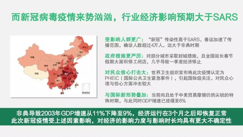 再者,疫情还与经济下行期叠加,带来不确定性。回溯非典期间,国内的GDP以11%的速度高速发展,而当前的GDP增速已经放缓至6%,且处于中美贸易摩擦仍然尖锐的特殊时期。另外,非典导致2003年GDP增速从11%下降至9%,不过经济运行在3个月后即恢复正常,非典对中国零售业的总体影响体现在连续3个月零售额同比下降5个百分点。国家统计局公布数据显示,2019年全国社会消费零售总额首次突破40万亿大关,达到41.2万亿人民币,同比增长8%,大于GDP同期增速的6.1%。而此次疫情受上述因素的影响,对经济的影响力度与时长均具有更大的不确定性。