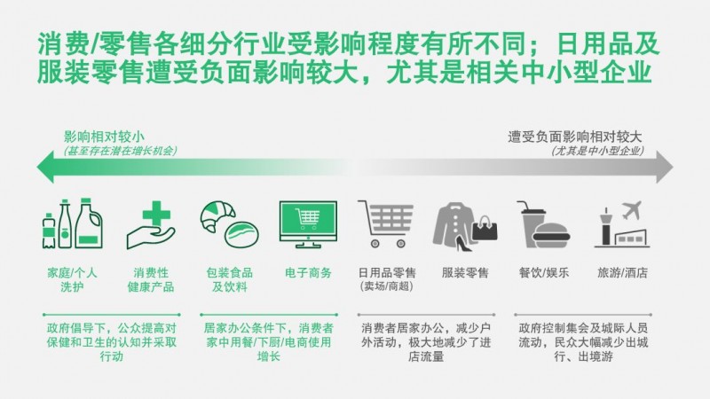 我们认为,对日用零售/服装零售而言,短期的影响体现为剧变式的行业扰动。例如消费需求降低,消费者整体信心下降;隔离措施导致门店停业或者部分闭店,线下经营熔断,前线员工闲置,士气低落;以及库存积压,物流运力不足,企业现金流压力增大,投资扩张信息不足等。长期来看,疫情将刺激日用/服装零售企业加速发展电商业务,并带动新零售布局、O2O等相关业务转型,尤其是行业领先企业,会加码布局“全渠道“战略。