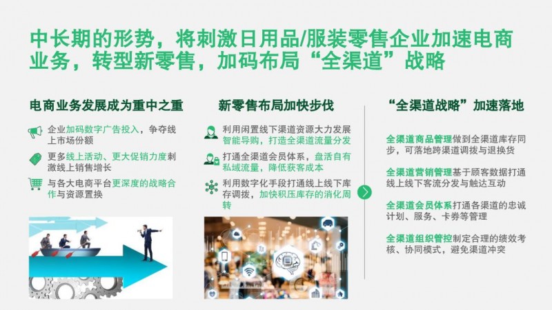 1转换渠道营销重心:从创新商业模式或新兴渠道中寻求新的增长机会,比如专注平台电商、社群电商、O2O等新零售渠道,丰富促销机制,确保资源与人才配置;营销向线上转移,内容需贴合社交媒体主旋律。同时需确保高需求产品的库存和配送能力;尤其注意销售从线下向线上的转移,并做好库存准备及协调。