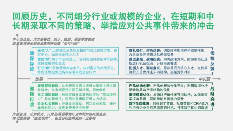 回溯过往,零售企业在漫长的历史长河中不断应对各类公共卫生、自然灾害、经济危机等事件。我们研究发现,不同细分行业或规模的企业,在短期和中长期采取了不同的策略举措来应对这些公共事件带来的冲击,各家企业不断创新思路,尽显“自救”招数。
