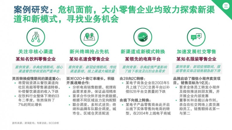 日用品/服装零售行业的大型零售企业则相对容易渡过难关,但也会因疫情受到一定影响。从过往的案例分析来看,他们选择实施上述举措的同时,考虑更多: