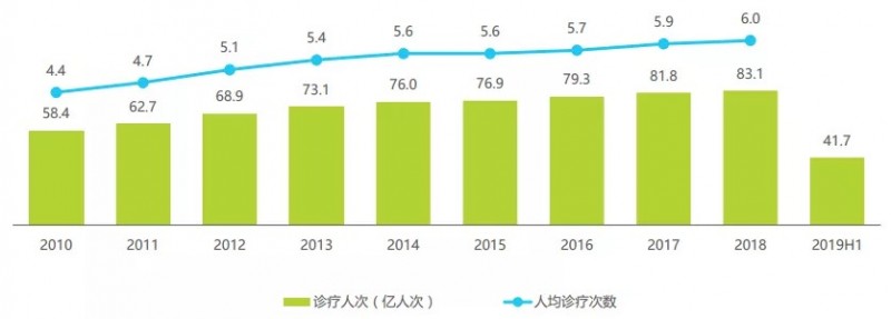 2010-2019H1中国年诊疗人次及人均诊疗次数