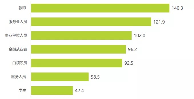 这类消费者的年龄段主要集中在26-45岁,其中66.1%处于已婚状态,90.3%的用户购买力归属为中等或高收入人群。其中教师、服务人员对缓解疲劳类保健品的消费需求更高。教师、服务业人员、事业单位人员成为核心焦虑群体,其在缓解疲劳类保健品目标人群指数分别高达140.3、121.9及102.0,在整体人群当中表现突出,而经济能力尚未成熟的学生则TGI指数表现略低。
