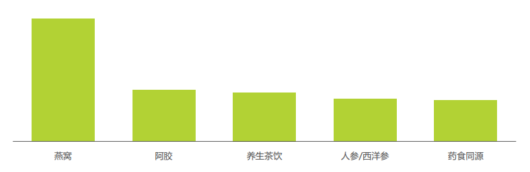 低龄化用户引领国潮保健消费增长,16-25岁的用户成交额占比从5.3%升至6.0%,16-25岁的用户成交额同比增长36.9%。燕窝、阿胶、养生茶为滋补食材类产品增长提供强势驱动力。在滋补养生类目中,燕窝成交额占比接近三成,独占鳌头;阿胶、养生茶饮、人参/西洋参等成交额也超过类目的一成。