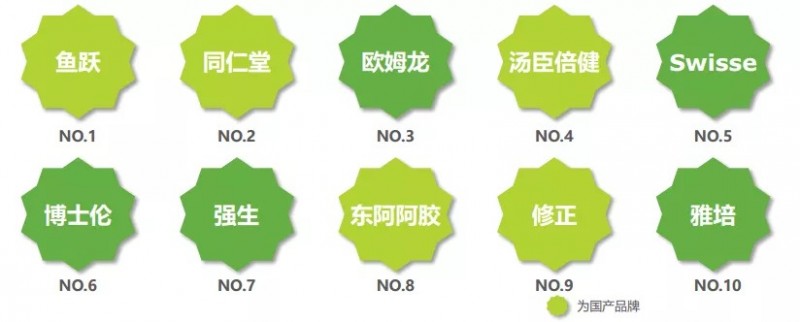 国潮风吹遍保健领域,国产品牌强势支撑大健康产品市场。大健康产品领域中,专注于医疗器械的鱼跃和传统国药老字号的同仁堂占据着TOP2位置。