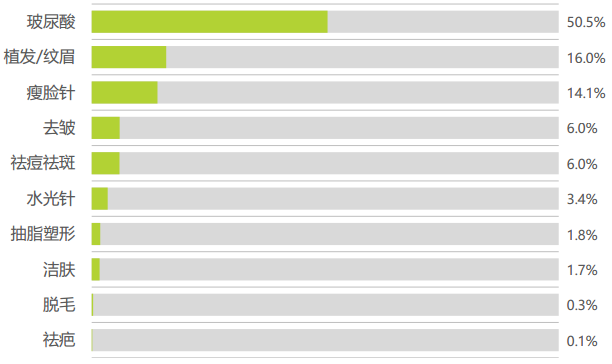 医美服务市场接受程度快速提高。玻尿酸、植发/纹眉、瘦脸类塑形服务合计占据8成市场份额。其中玻尿酸成为当之无愧的美容塑形爆款产品,单品年度成交额占比已超过50%,成交额占比在10%以上的美容塑形产品服务,除玻尿酸外则有植发/纹眉及瘦脸针, 三者销售份额合计超过80%。