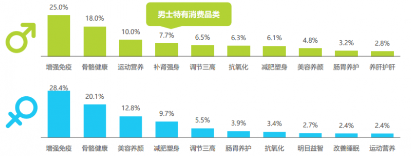 男士运动强身诉求集中,女士保健诉求多样化:增强免疫与骨骼健康是群体消费共性,“补肾强身”,“养肝护肝”则是男性特有的消费品类,成交额分别占比7.7%与2.8%,“美容养颜”与“减肥塑身”两类产品在女性保健品类中消费占据前五。