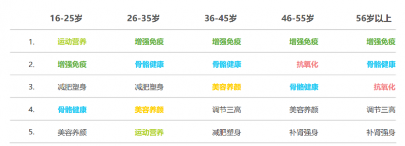 80后热衷美容养颜,90/95后注重运动塑身:各年龄段消费者在保健品方面,普遍均注重对免疫增强与强化骨骼健康的消费。此外,90后年轻群体更注重运动营养与减肥塑身;而在26-45岁群体中,美容养颜类保健品则进入消费前五;46岁以上的用户,抗氧化产品消费则进入到TOP3位置。