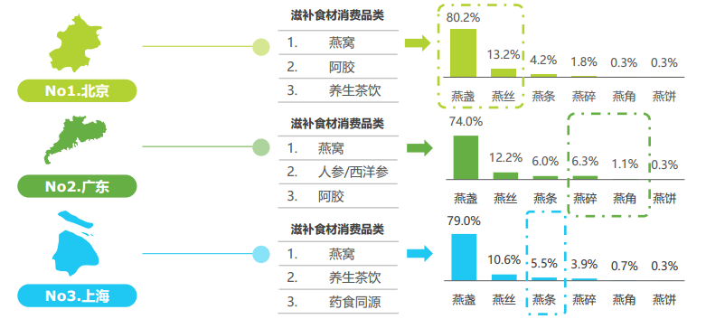 ★燕窝消费北京大气阔绰,上海精致理性,广东低调内敛:北京地区燕窝消费以价格较高燕盏燕丝为主,合计占比超过93%;上海消费者精致理性,有5.5%的燕窝消费选择在有较高性价比的燕条;广东人民最为低调,高单价的燕盏燕丝消费为三地最低。