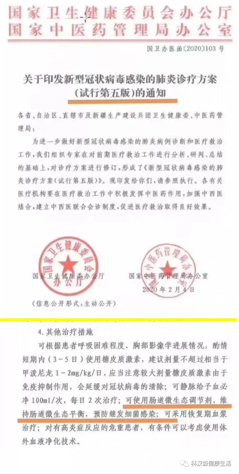 在国家卫生健康委员会与国家中医药管理局1月27日发布的的新型冠状病毒感染的肺炎诊疗方案(试行第四版)中,肠道微生态的平衡被纳入治疗措施的一部分。同时在2月4日更新的第五版时,这一方案再次得到保留。
