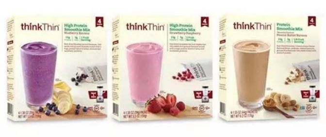 thinkThin高蛋白水果奶昔,将新鲜水果、奇亚籽、亚麻仁和高达15 g的蛋白质混合,加入杏仁乳和冰沙制备而成,图片来源:Google