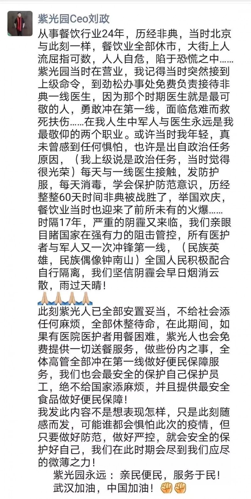 “时隔17年,严重的阴霾又来临,我们亲眼目睹国家在强有力的阻击管控,所有医护者与军人又一次冲锋第一线!此刻紫光人已全部安置妥当,不给社会添任何麻烦,全部休整待命!在此期间,如果有医护者用餐困难,紫光人也会兔费提供一切送餐服务,做些份内之事!全体高管冲在第一线的同时,我们也会保护自己的员工,绝不给国家添麻烦!”