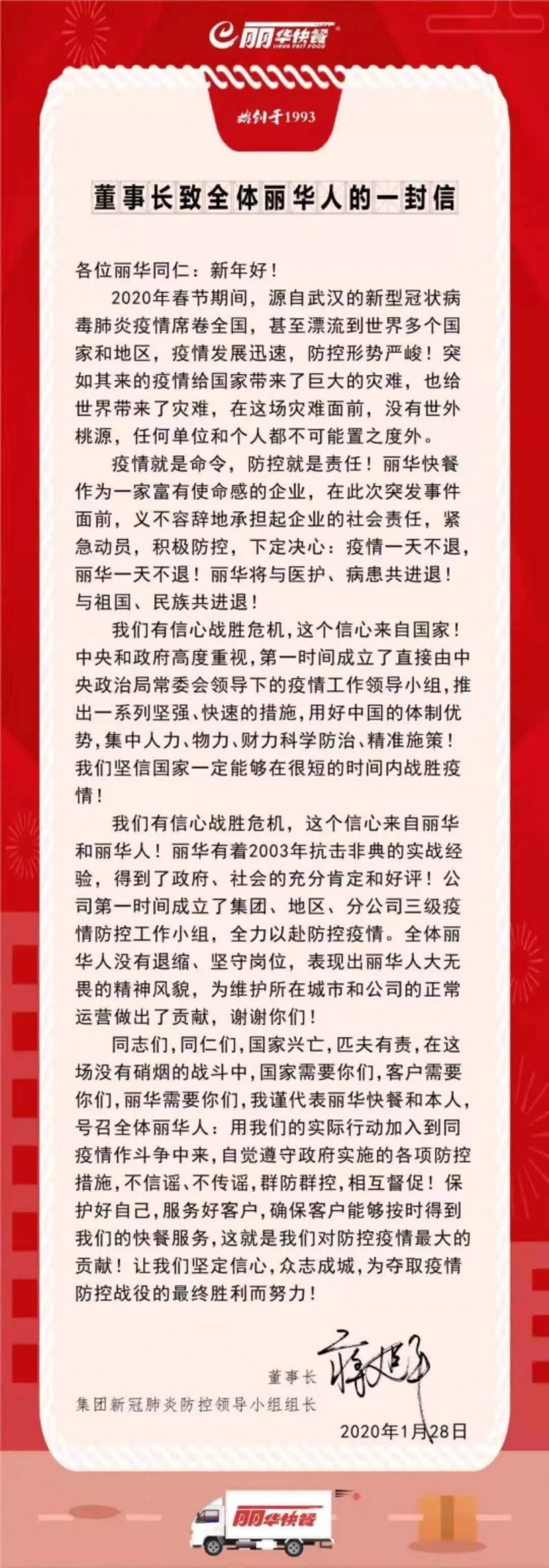 丽华快餐董事长蒋建平在给丽华人的一封信当中说:“疫情就是命令,防控就是责任!今年公司第一时间成立了集团、地区、分公司三级疫情防控工作小组,全力以赴防控疫情,全体丽华人没有退缩、坚守岗位!”
