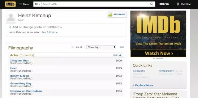 亨氏不愧是亨氏,有自己独特的想法。在今年奥斯卡期间,亨氏番茄酱与代理商Rethink合作,进行了一场有趣的campaign——为这个著名调味品建立一个正式的IMDb页面。