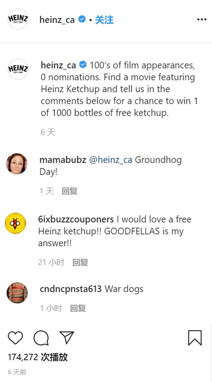 这个页面在上线不到一周后,很快被IMDb官方撤下,但亨氏迅速将它变成了一场与观众的互动。他们在facebook和ins等社交媒体上都发起了活动,邀请“粉丝们”寻找有亨氏番茄酱客串过的电影,并在社交媒体上分享这些影片,即可获得免费番茄酱。