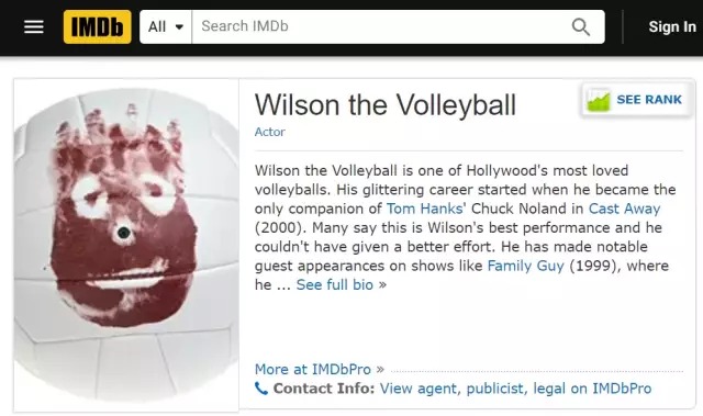 Wilson排球,因为在电影《荒岛余生》中的出色表现,而拥有自己的IMDB页面