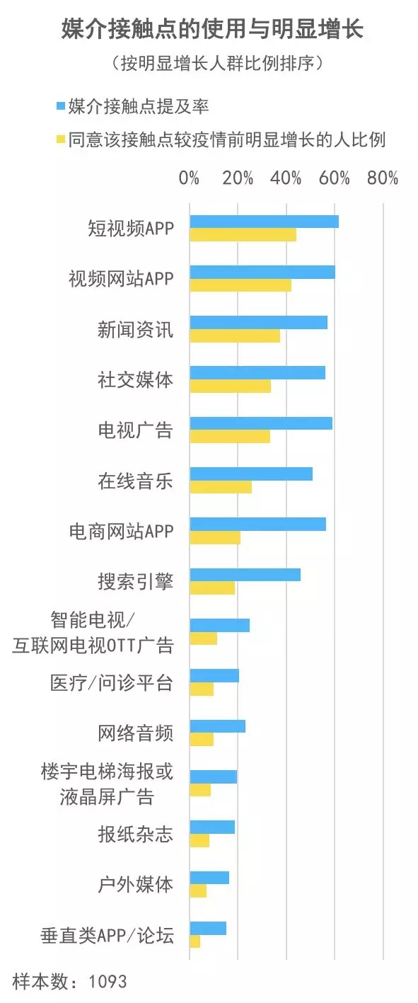 疫情也改变了人们对媒体的使用习惯。有超过40%的受访者表示他们使用短视频和视频网站的时间明显高于疫情爆发之前,其他增长明显的媒体接触点还有数字新闻资讯平台(37%提及)、社交媒体(34%)、电视广告(33%)、在线音乐(26%)。