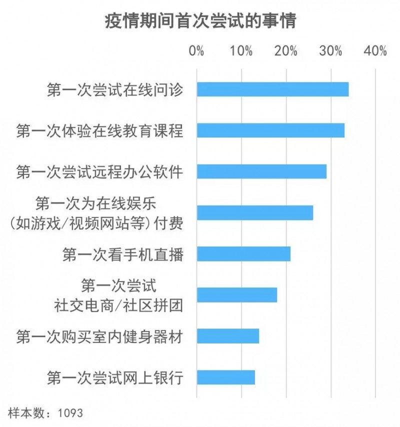 非常值得注意的是本次疫情推动了很多消费者第一次尝试之前没有使用过的东西,为很多新兴行业的渗透率提升提供了机遇。在所有受访者中,有84%的人都表示至少尝试了一种新的服务,其中提及最高的是网上问诊(34%)和在线教育(33%),其次是远程办公(29%)和第一次为数字娱乐服务付费(26%)。