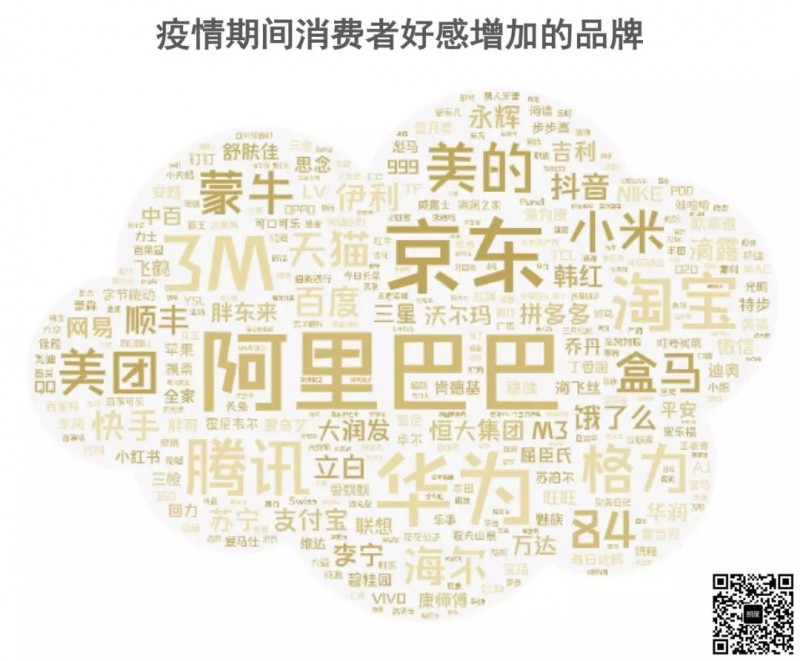 在本次调查的最后,我们请大家提名在本次疫情期间让他们好感增加的品牌(最多三个),并且解释原因。从消费者们提及375个品牌的回答中,我们可以发现,有些品牌是因为它们为了支持疫情的捐款捐物行为得到了提名,也有不少品牌是因为他们在疫情这样极其罕见而困难的情况下,仍然能一如既往地高质量地向消费者提供他们的服务和产品。这也从另一个方面体现了品牌的价值。雪中送炭胜过锦上添花。我们相信在这样的时期下赢得的口碑将能够长久地支持品牌的发展。